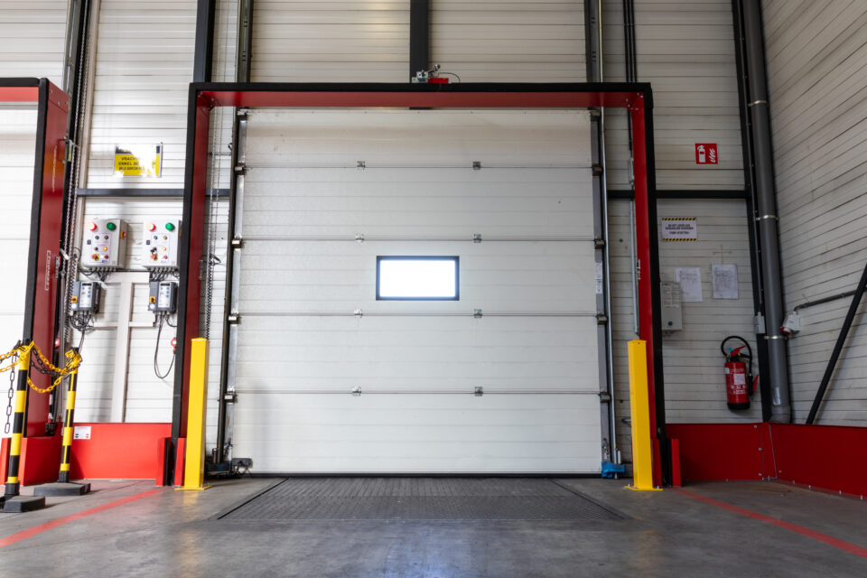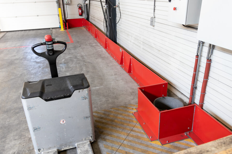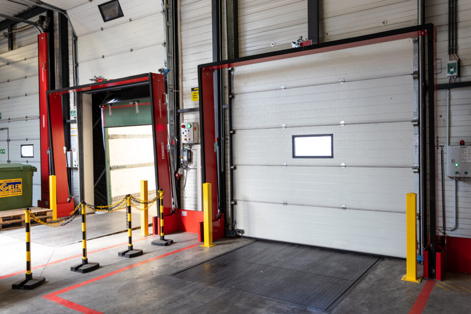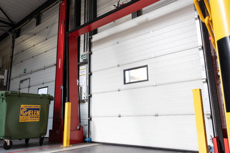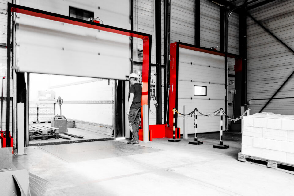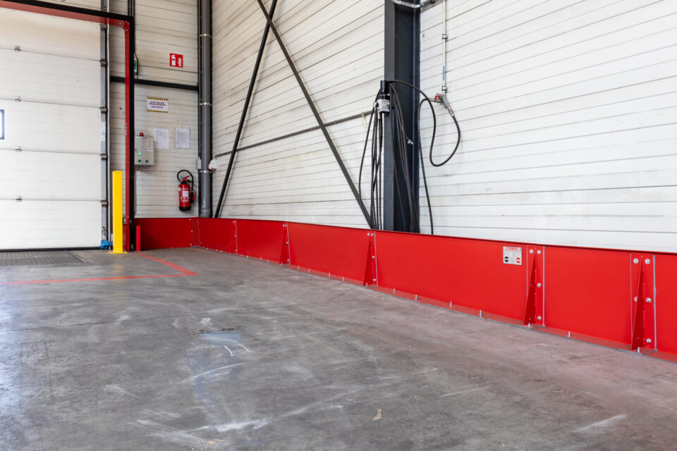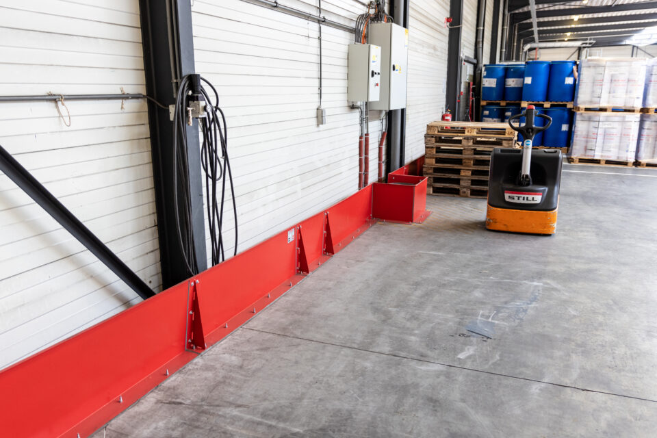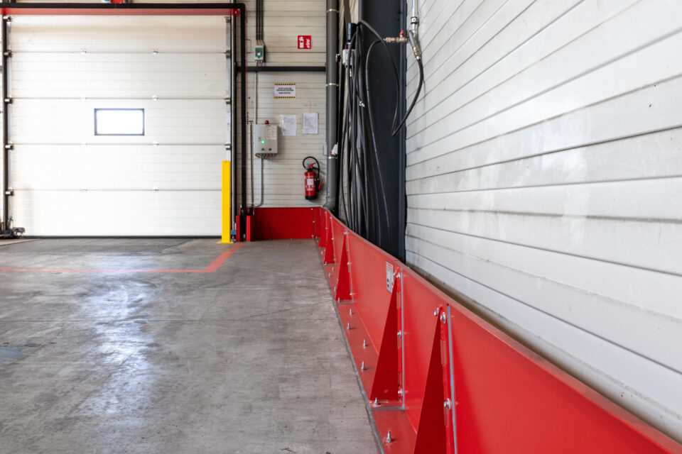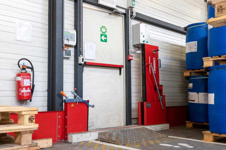 - Aan elke laadkaai en deuropening plaatsten we half-automatische barrières. Bij melding van brand (gekoppeld met de brandmeldcentrale) sluiten de barrières automatisch. Het openen verloopt manueel.