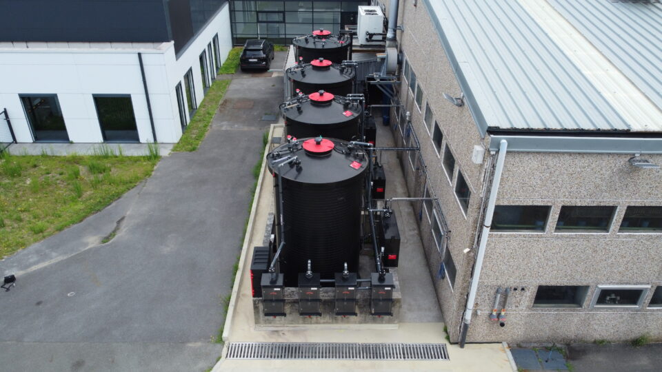 We installeerden een nieuwe opslag- en doseerinstallatie, opgebouwd rond vier zwarte dubbelwandige kunststof opslagtanks: