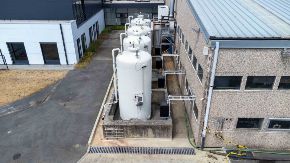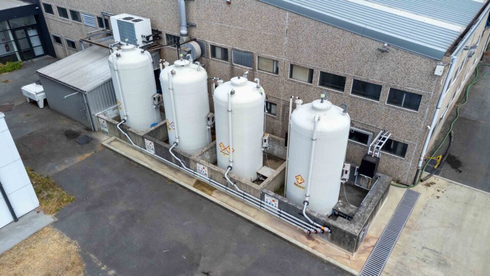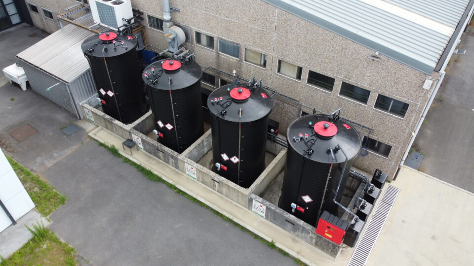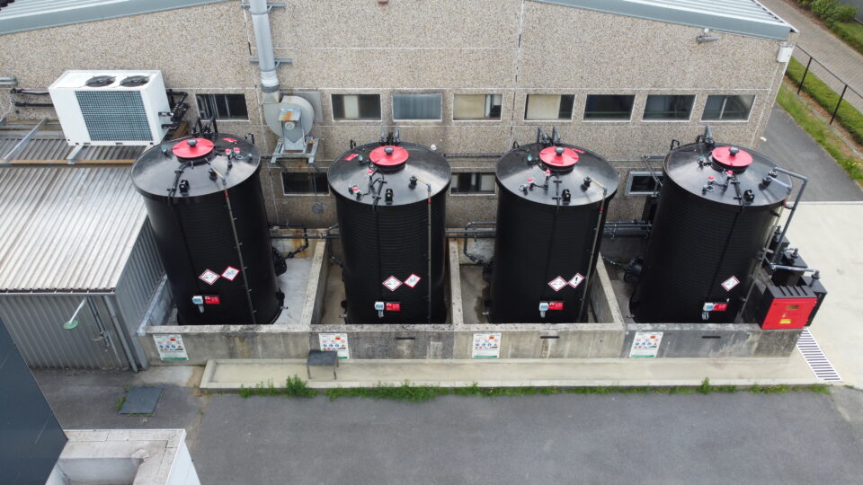 MEC Europe gebruikt vier sterke chemicaliën als grondstof: mierenzuur, zwavelzuur, salpeterzuur en waterstofperoxide. Deze werden opgeslagen in verouderde witte GVK-tanks die inmiddels waren afgekeurd. Een veilige, duurzame en conforme vervanging was dus nodig.