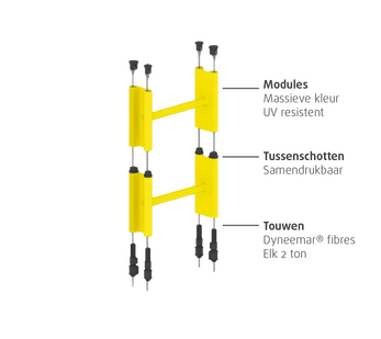 Wat de LifeLadder uniek maakt, is de slimme constructie die de voordelen van een touwladder en een vaste ladder combineert. De modules zijn stevig met elkaar verbonden door synthetische touwen en samendrukbare rubberen afstandhouders. Dit maakt de ladder flexibel en stabiel tegelijk. Bovendien is de LifeLadder uiterst duurzaam: bij schade hoef je enkel de gebroken modules te vervangen, niet de volledige ladder.