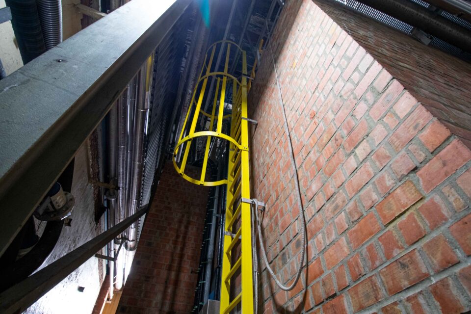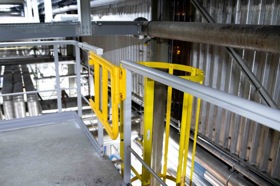 - Daarnaast vervingen we de oude ladder door een nieuwe kooiladder met zelfsluitend veiligheidshek, uitgevoerd conform de geldende normering (EN ISO 14122 voor vaste toegangsmiddelen).